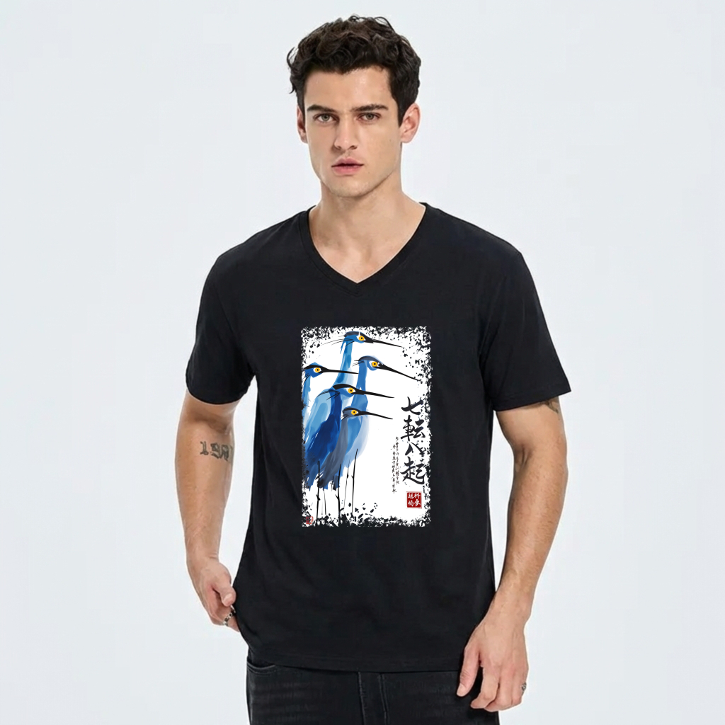 Blue Heron Art Design T-Shirt With Chinese Calligraphy And Seal Print
